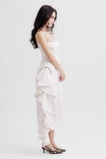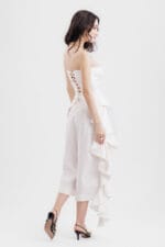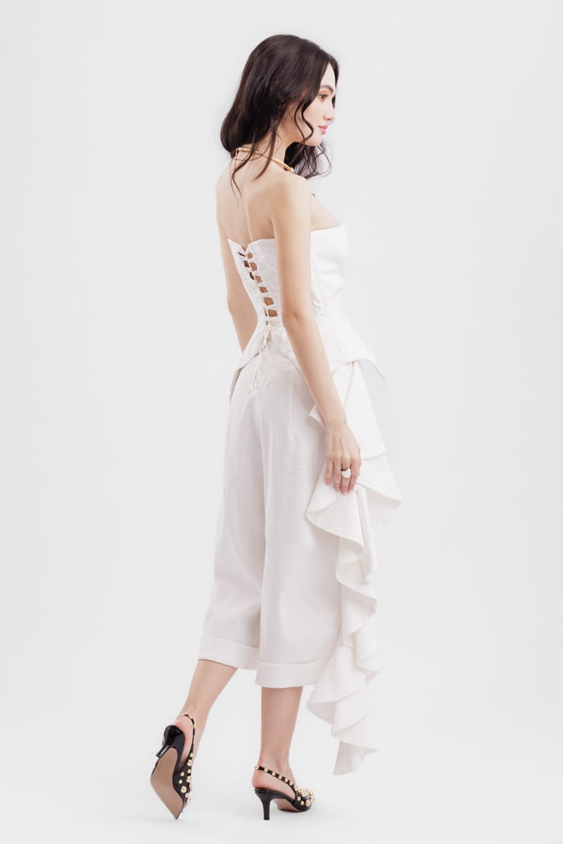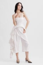 O reinterpretare modernă a pantalonilor clasici, modelul „White Cascade” combină structura confortabilă a bumbacului cu un detaliu statement – un volan lateral fluid care adaugă mișcare și eleganță ținutei.